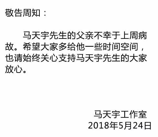 不过到了第二天马天宇工作室发出声明表示,马天宇的父亲于上周不幸病故。