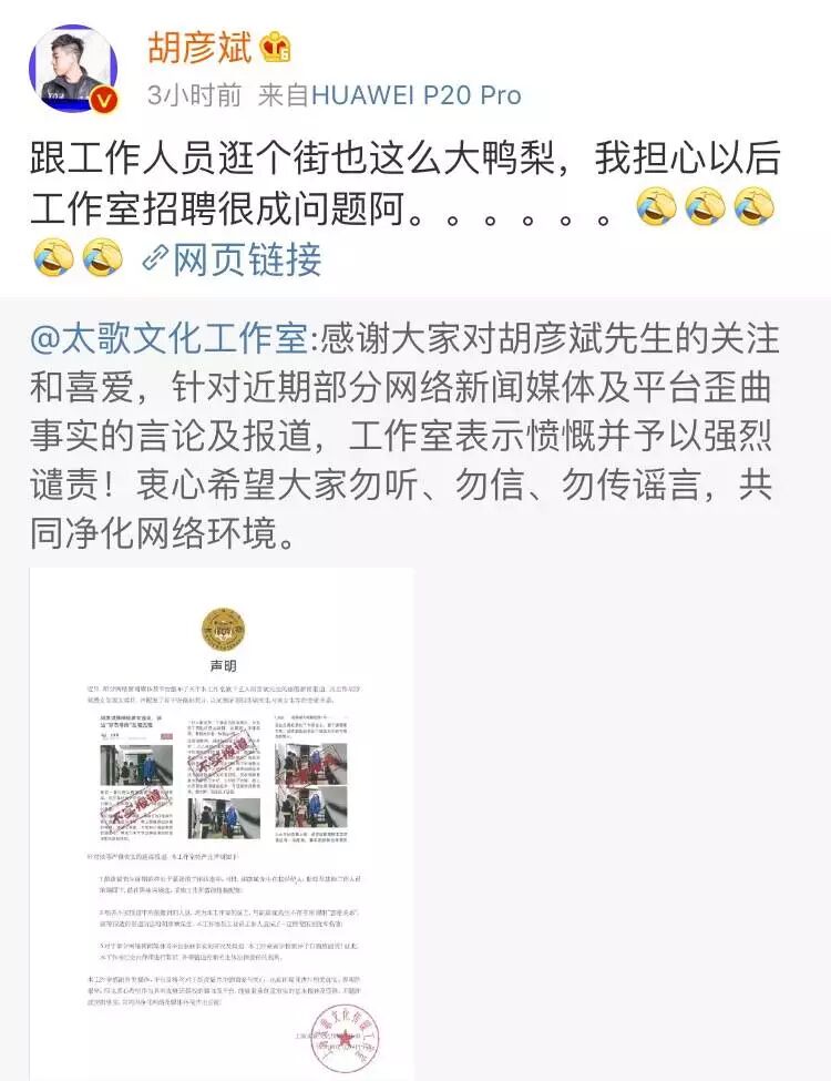 胡彦斌自己也发声表示:跟工作人员逛个街也这么大鸭梨,担心以后工作室招聘很成问题。