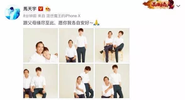 前天,马天宇发了一组和父亲的合照。配文:跟父母缘尽至此,愿你我各自安好~ 不过随后又秒删了微博。
