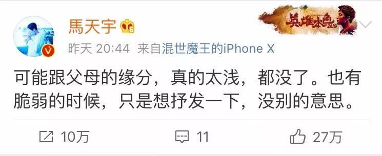 因此这条微博让网友猜测,马天宇跟父亲之间的关系是不是又恶化了。