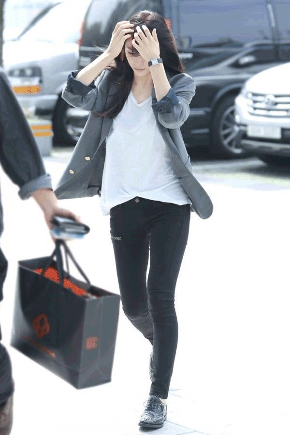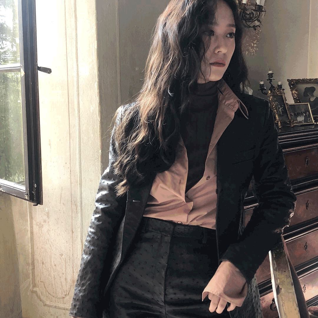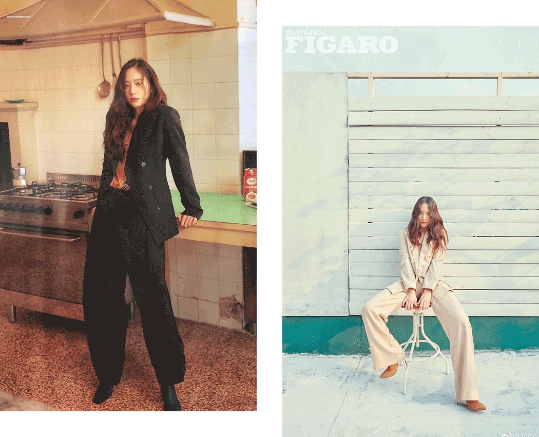 她冷冷的气质和腿长人高的身材,很适合穿西装。特别是性冷淡黑白灰和复古格纹。
