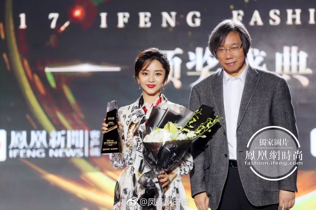 谭松韵获得2017年度票选“ 网友最爱人气Icon”奖,由北京文投集团总经理戴自更为她颁发奖杯