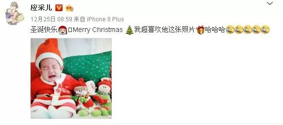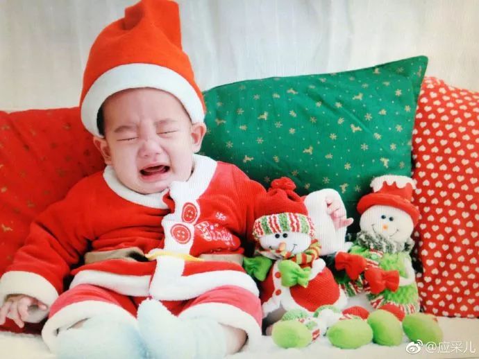 刚过去的圣诞节,应采儿发了一个特别应景的微博:一张jasper很小的时候穿着圣诞老人衣服的照片。