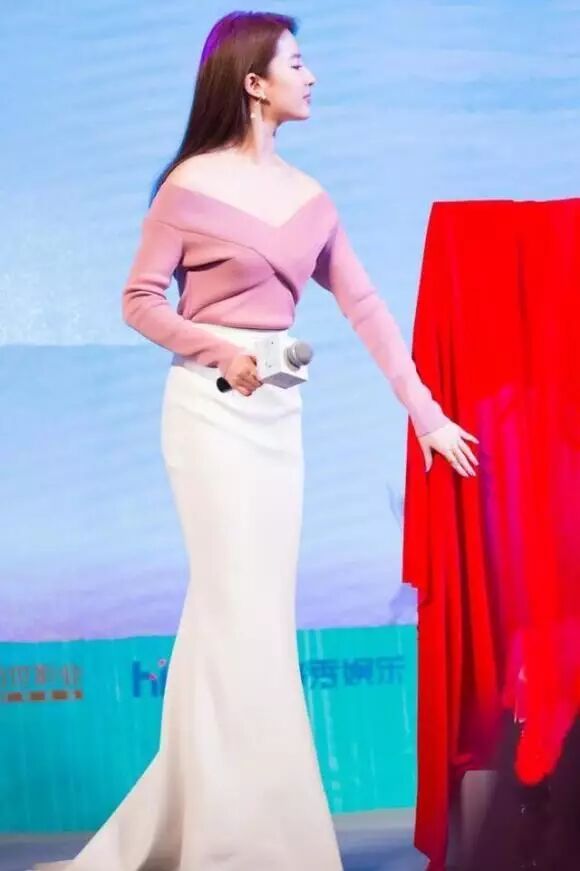 刘亦菲跟风潮流穿一字肩粉色上衣搭白色鱼尾长裙,穿出了柔美的小女人味。