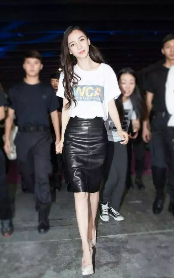 简单的字母T恤搭黑色小皮裙,脚踩方头高跟鞋,很清新又性感。