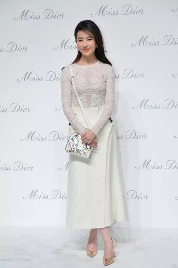 刘亦菲穿白色不规则长裙搭蕾丝透视上衣,脚踩金色尖头高跟鞋,整体打扮清新时尚。
