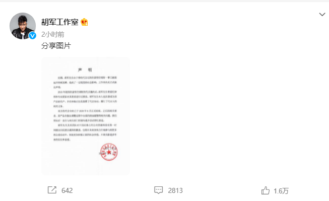 微博胡军工作室发布声明致歉
