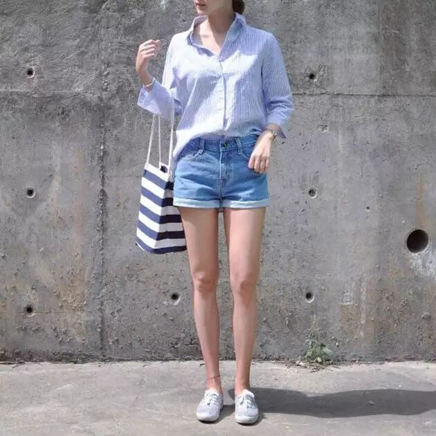 蓝条纹和水蓝衬衫今年有多流行应该不需小编赘述了,慵懒的衬衫碰上All White,不造作的性感就是这样~无论是短裤还是短裙,高腰线是大长腿的小心机体现哦。