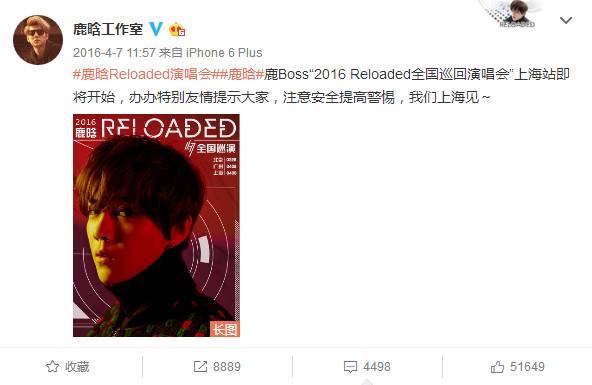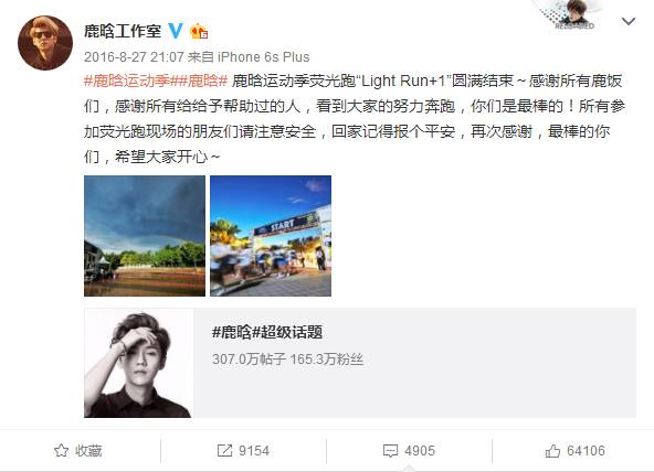 除此之外,“暖心鹿”还十分感恩粉丝应援,处处为粉丝着想,经常担心他们的安全,所有粉丝参与的大型活动,鹿晗工作室都会附带加一句贴心的安全提醒。