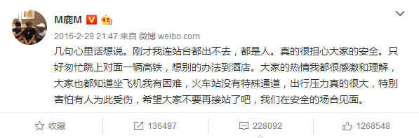 对此情况,鹿晗通过微博发文,称连站台都出不去,自己很担心大家的安全,希望在安全的场合和大家见面。鹿晗工作室在同一天也通过微博呼吁称:“首先感谢大家的热情与支持,但为了不影响公共秩序以及诸位大家的安全,也为了同行的旅客能顺利出站,请所有接站的大家尽快疏散,给旅客们让出通道。注意安全!!!感谢大家!谢谢!”