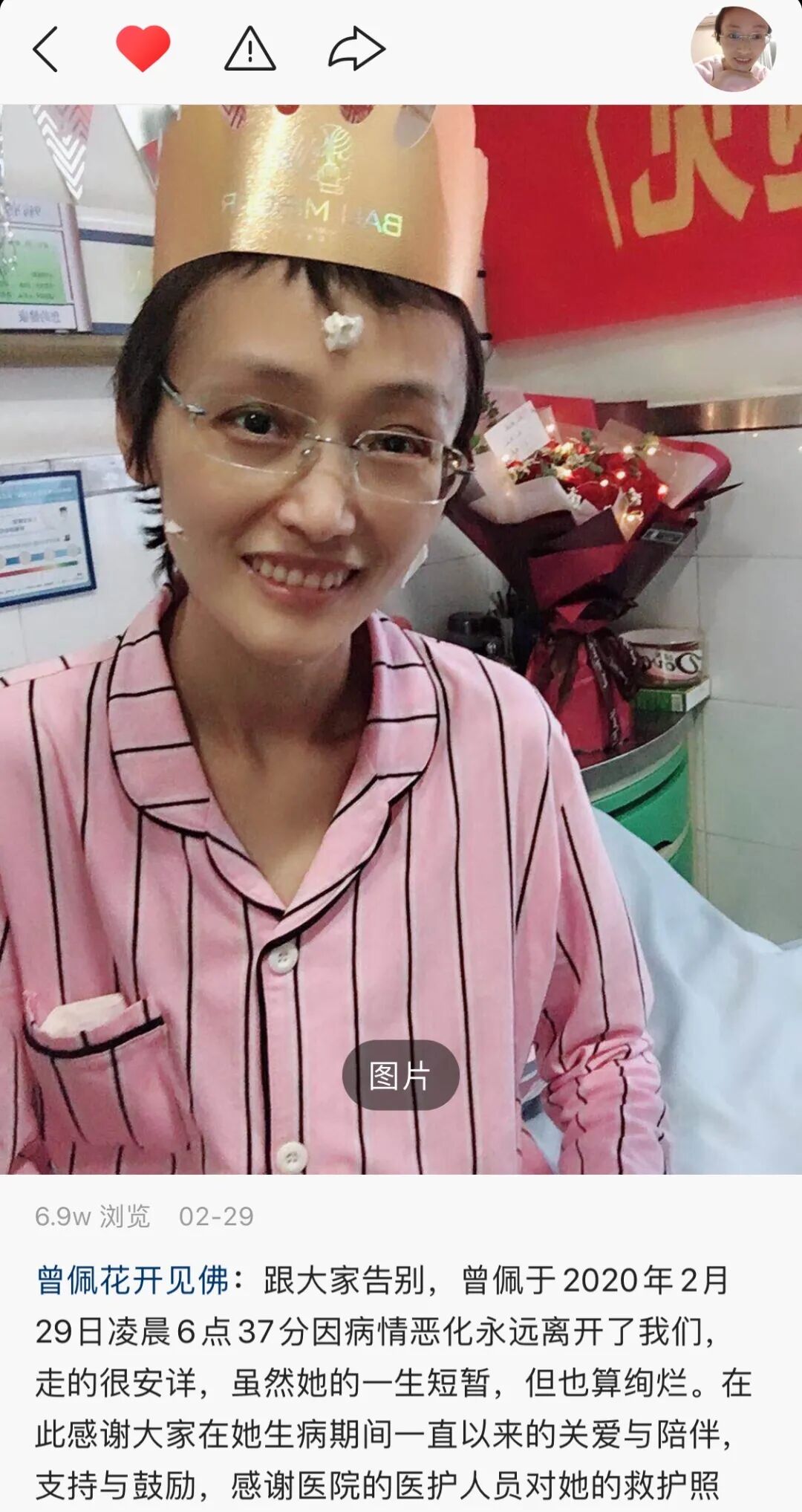当大家真的以为生命出现奇迹时,今年2月底,曾佩许久没有更新的快手账号,终于发了一条动态。曾佩去世了,在快手上过了两个生日的她,还是没等来和老铁们一起度过的第三个生日。