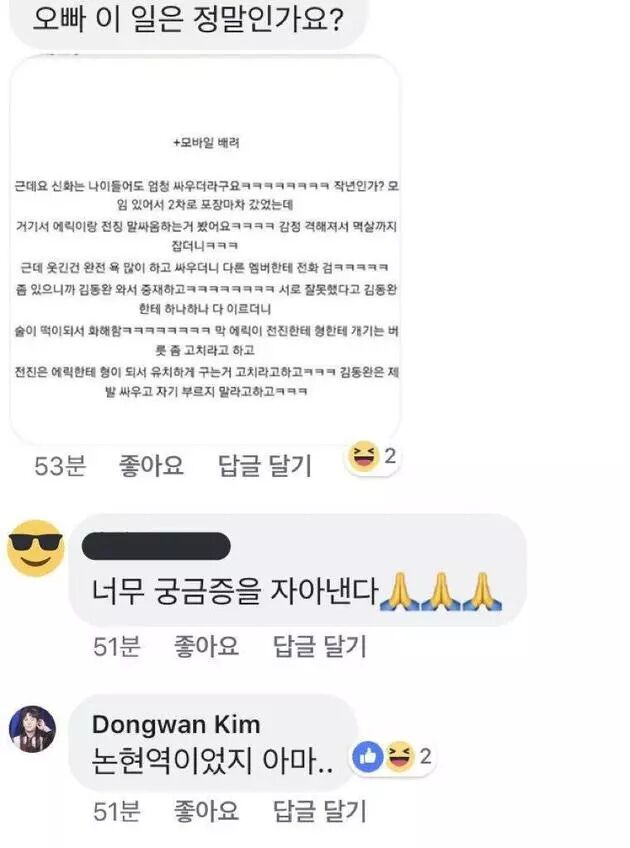 韩网日前有人表示,在一家路边摊里目击Eric和JunJin大吵,不但互骂脏话,吵到最后还互抓衣领,眼看就快要打起来,结果接下来的动作竟是打电话,隔没多久金烔完赶到现场,两个人看到队友来了,一股脑地向金烔完告状、都说是对方做错了。