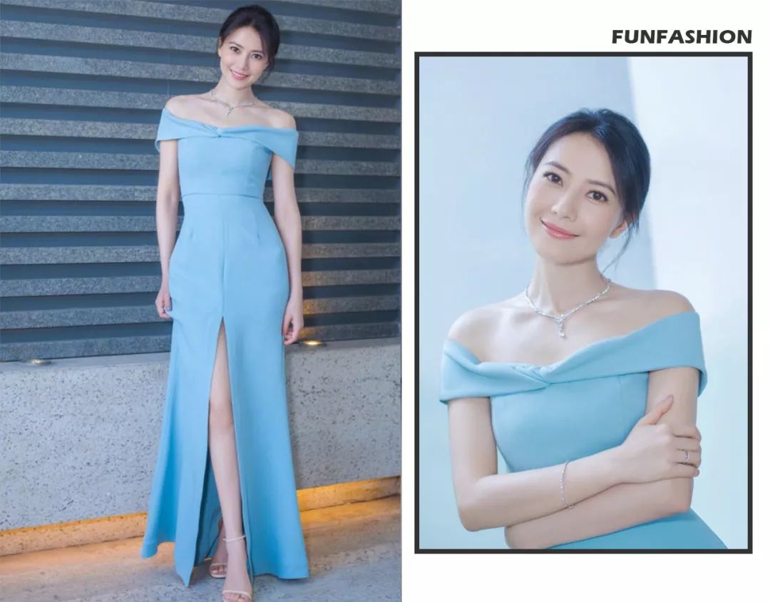 圆圆女神真的蛮适合穿这种蓝色的,之前的几次蓝裙子造型也都相当出彩,特别映衬肤色气质。露肩和高开叉的小心机,很好的扬长避短。我们之前讲过的身材小Bug,一点都没显露出来哦!