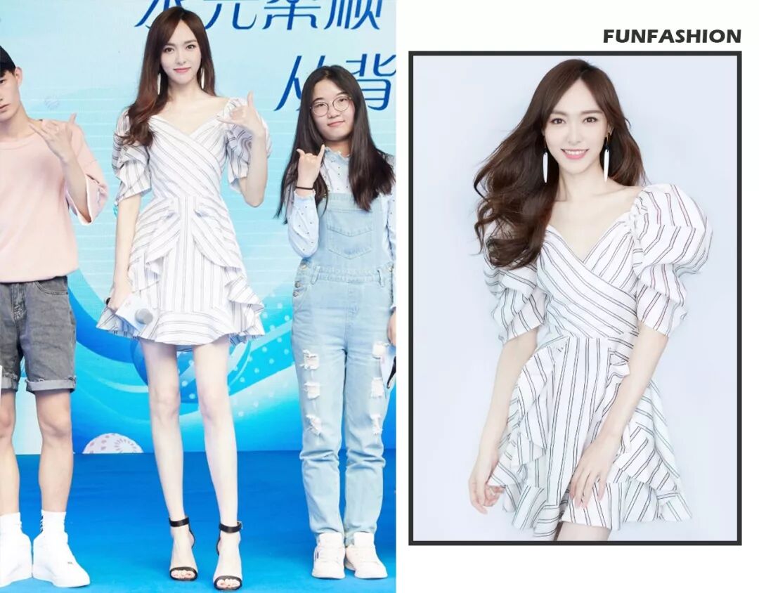 首先,请先忽略掉唐嫣P到反光的肤色,咱们单纯看穿搭。如果你和她一样是精瘦精瘦的小骨架妹子,那么这种梦幻少女感十足的泡泡袖真的可以尝试一下哦!尤其是竖条纹的图案设计,不必担心会在视觉上看着臃肿呢!