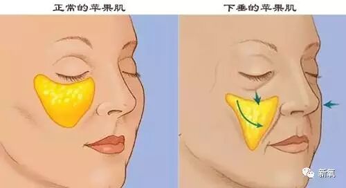 然后呢,我们的苹果肌,也就是颧脂垫会因为重力和衰老下垂,形成法令纹。