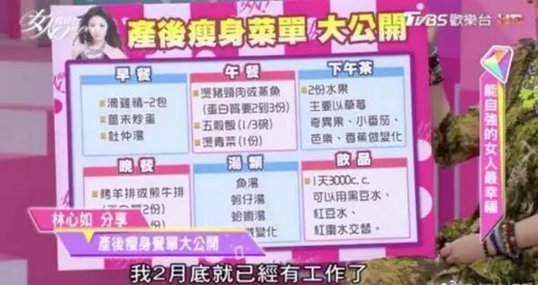 林心如曾分享过自己的减肥餐,因为还需要母乳,也可以看到饮食还是比较丰富的。