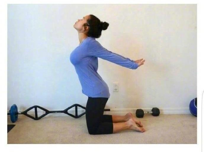 具体方法:双脚跪在瑜伽垫上,脖子抬起,双手向后伸展。