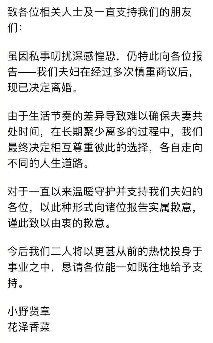 2025年9月14日,花泽香菜与小野贤章同步发布联合声明宣布离婚,引发热议!