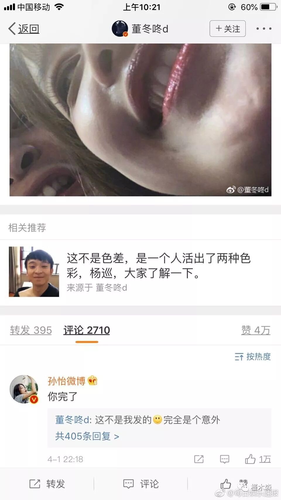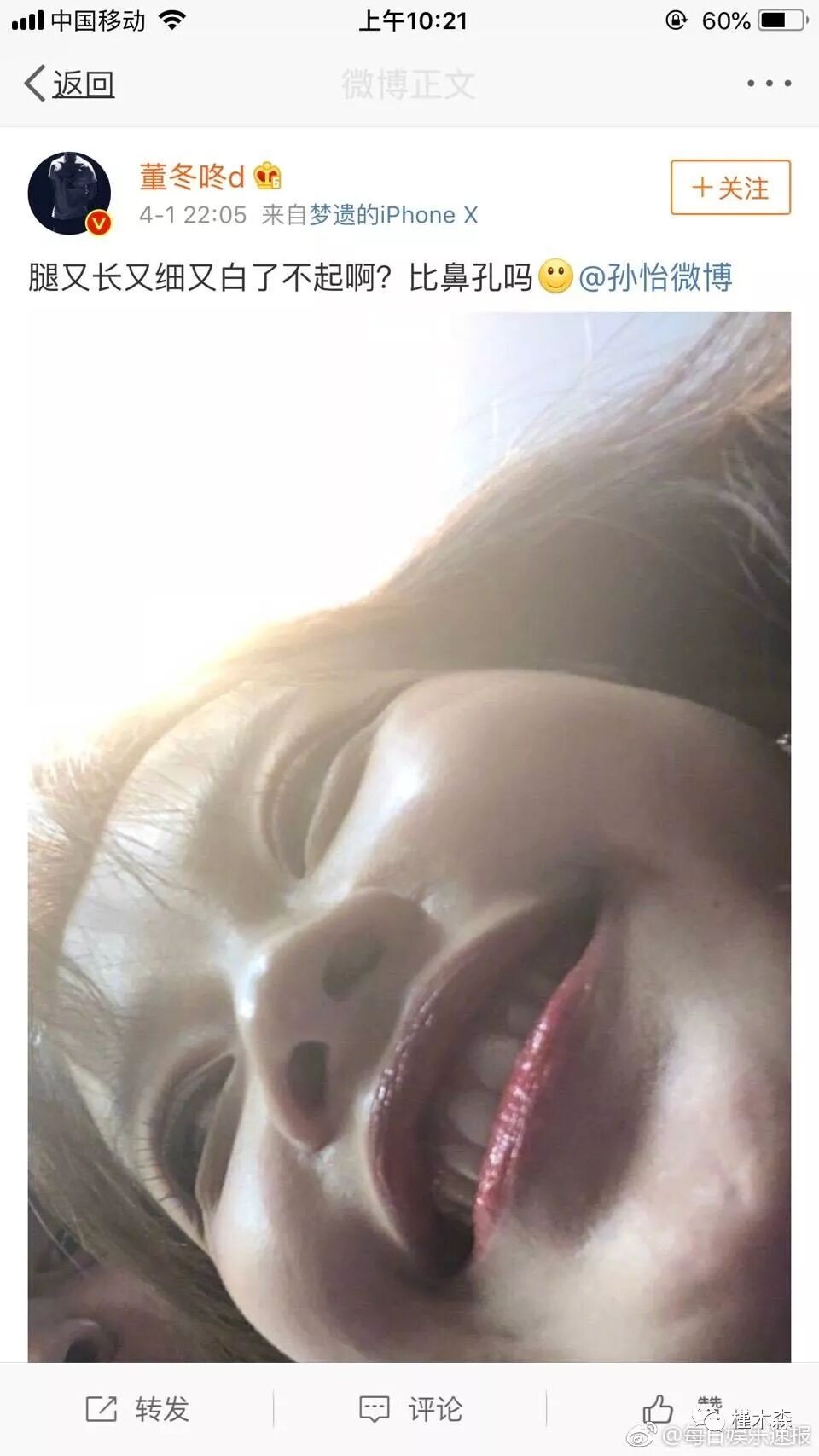 网友们纷纷回应:董子健胆子肥了在微博晒出一张孙怡“放飞”的搞怪自拍,斜角的拍摄角度,还叫板:"比鼻孔吗".
