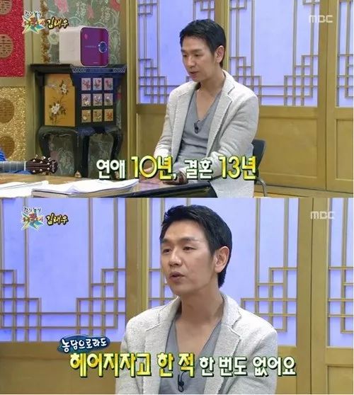 演员金泰佑上大学时参加了一个展会,并在那里遇到了一位好朋友的小学同学,而这位朋友的同学也最终成为了他后来的妻子。据说在这样一次浪漫的邂逅中,金泰佑感觉到了“她就是我寻找的那个人”,两人的缘分也由此开始。此后尽管两人开始交往,但由于妻子远赴美国留学,因此在10年的恋爱期间里,他们经历了长达7年时间的异地恋。有情人终成眷属,同岁的两人最终走在了一起,相互尊重和关心成就了他们永恒的爱情。