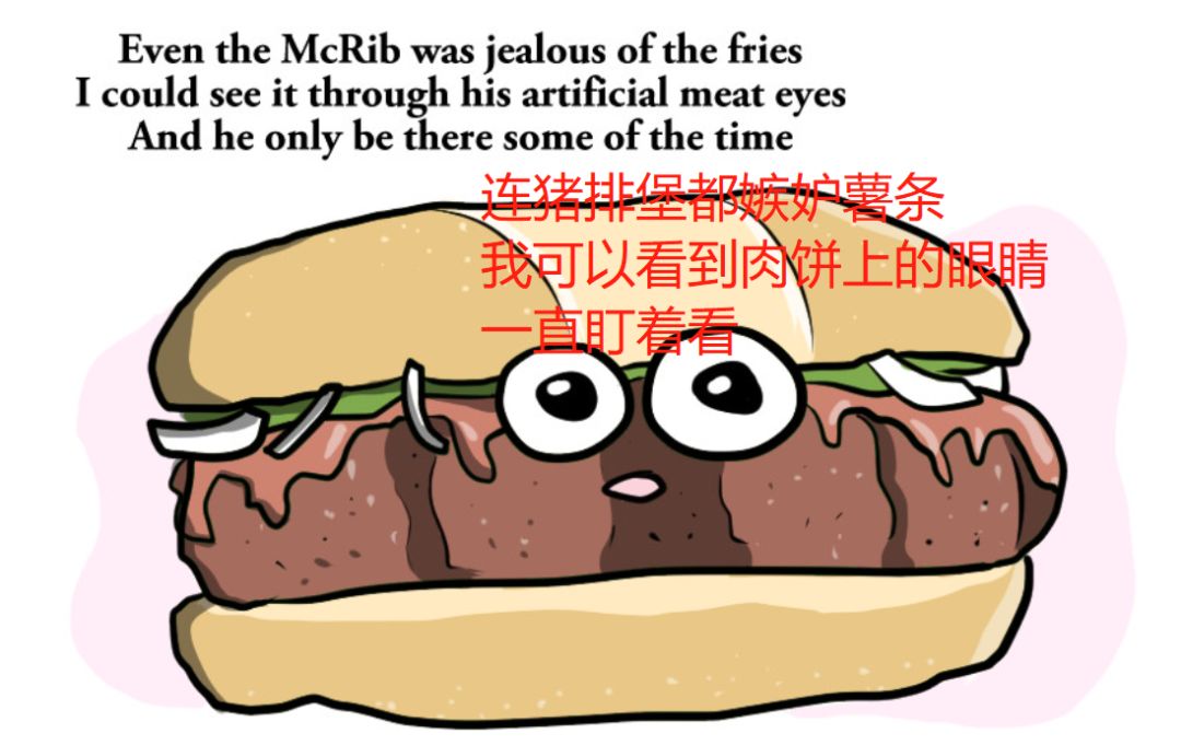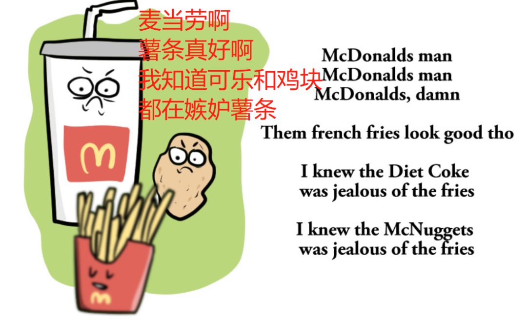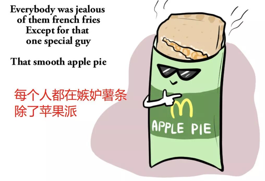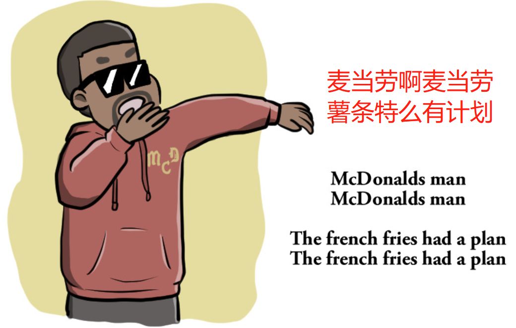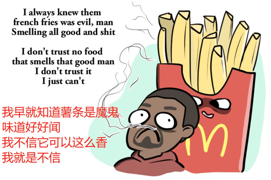 这逼诗翻译得猿猿贼特么蛋疼...反正说来说去就是称赞麦当劳的薯条,除了薯条外,最好吃的就是苹果派...各位,看到这里请相信你们的眼睛,这首诗来自我们最为熟悉的 Kanye West,而不是一个脑瘫智障儿童....