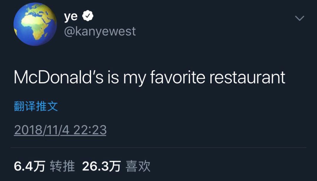 侃爷又上了推特热搜了...这一次,不知道大哥是不是刚吃完心情比较愉快,拿起手机就发出了这样一则推特——“麦当劳是我最喜欢的餐厅”。