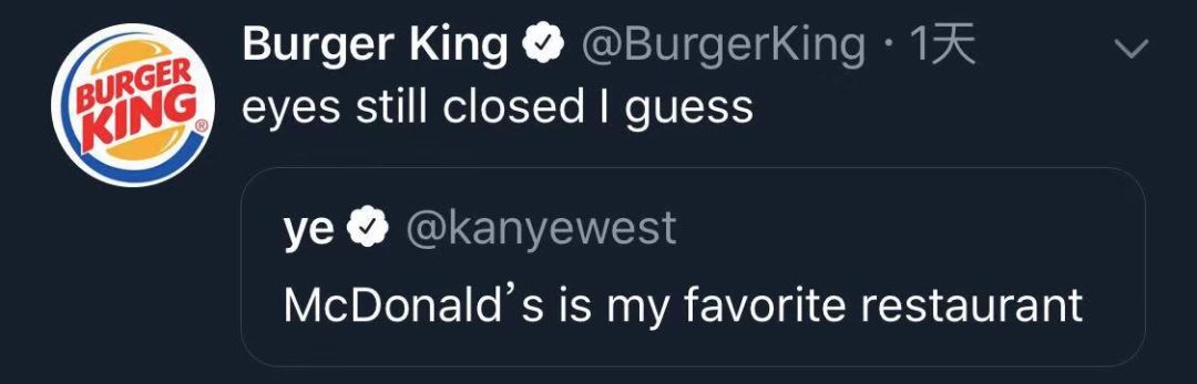 这段说侃爷“眼瞎”的言论是回应侃爷在前不久发表的一番看法,在推特中,侃爷曾表示“自己最近眼界大开(Wide Open)”。可转眼间就被汉堡王嘲讽“眼瞎”,侃爷你为何只爱麦当劳不爱我?