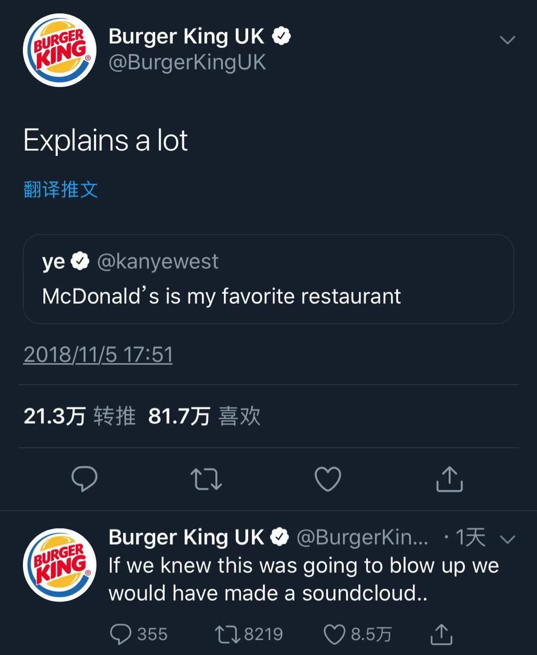 随后汉堡王英国官推又补充道,“早知道事情会这样,我们就录一首歌了(来diss你)”。