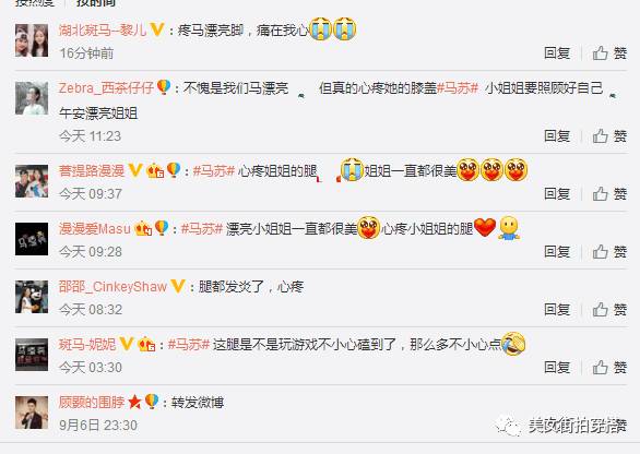 而当把注意力吸引到腿上,细心的网友就注意到马苏膝盖上的亮点,怎么膝盖贴了胶布了,可从网友们的评论可以看出,还是很有爱的~咳咳,纷纷心疼马苏一秒钟