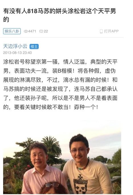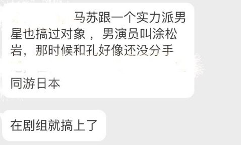 在他爆料的微博下面,有个女演员也爆料了,说07年马苏和孔令辉在一起的时候劈腿了她的男朋友,说马苏那时候天天混夜店,私生活特别乱。