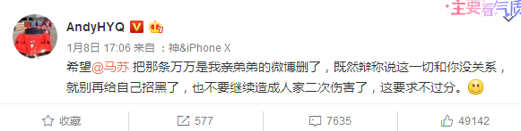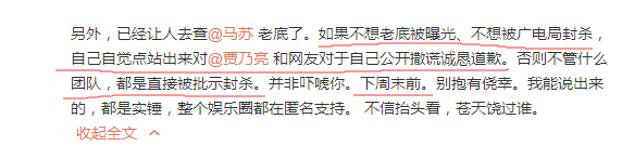 然后新一届的娱乐圈纪检委黄毅清就看不下去了,让马苏删除微博,还说已经派人去查她了,如果她不想被封杀的话,就赶快道歉。