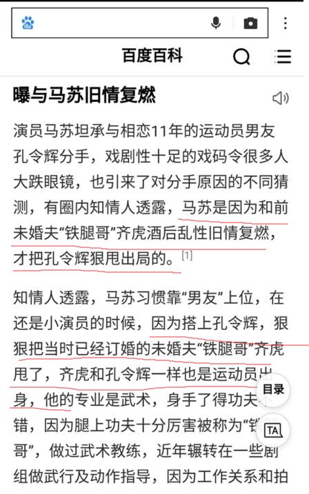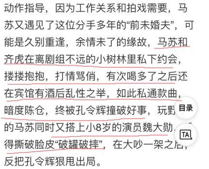 而这一段百度百科上也有记录,大概就是马苏和齐虎在一起时认识了孔令辉,然后劈腿了,但和孔令辉在一起后又和齐虎旧情复燃、酒后发生不正当关系,然后又搭上了魏大勋。和孔令辉这段当然就拜拜了。