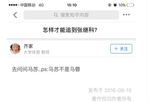 万万没想到,张继科也被卷进来了。而早在16年8月,知乎上就有人神预言了这事,有人问怎么才能追到张继科,一个人回答去问马苏。