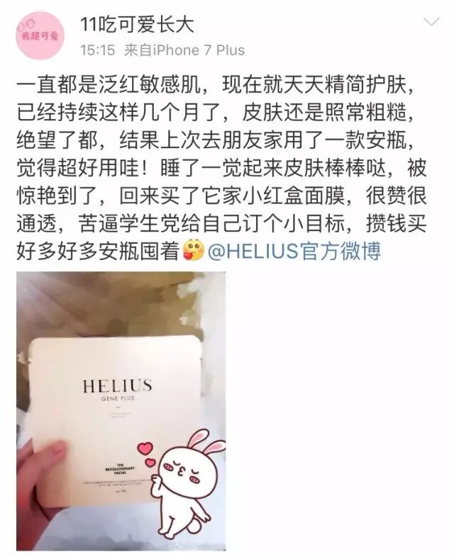 上个月出门旅行,皮肤晒黑不说,还有点晒伤了,回家就用HELIUS的小白盒面膜加他们家的玫瑰修复安瓶,差不多三片面膜加两支安瓶,晒伤的皮肤居然神奇的被修复了,然后色号起码白了2个度左右!直接被惊艳到。