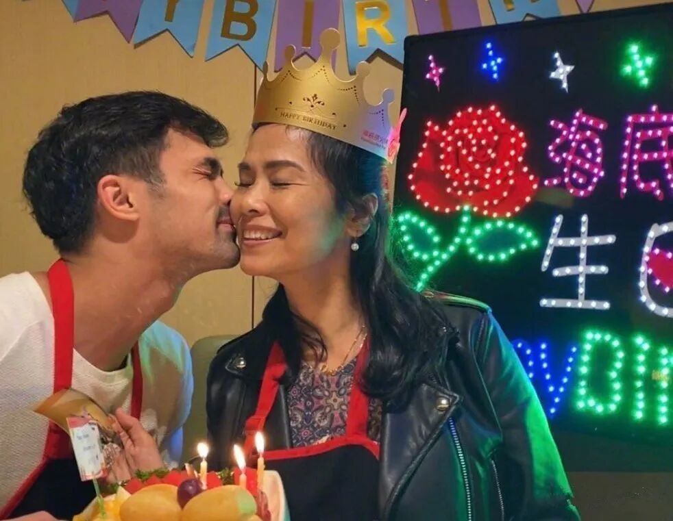 这次应该是她在过生日,可以看到整个人笑得比较的开心,但是脸上也是完全没有化妆感觉显得整个人还是比较接地气的那一种,里面是穿着一条碎花裙,颜色比较深外面搭配了一件皮革外套,还是比较的干净利落的