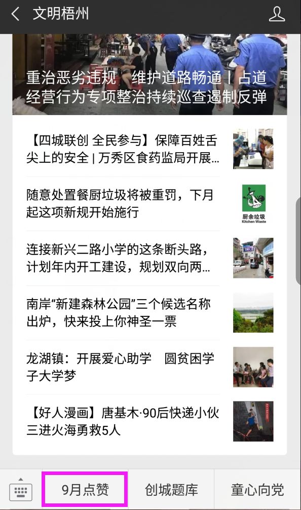 (1)进入“文明梧州”微信公众号,点击底部菜单“9月点赞”参与。
