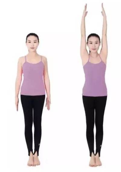 双肩下沉,脊柱和头颈保持向上延展;吸气,双臂上举,掌心相对;呼气,双肩外旋下沉,底肋柔软内收,指尖向上延展,注意充分伸展腋窝;保持腹式呼吸,重复3~5组。
