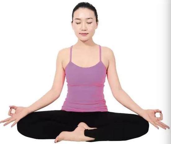 双脚前后交叠,双膝外展下沉;双手轻搭于膝上,食指与拇指轻触,呈智慧手印;吸气时,延展脊柱,呼气,双肩下沉放松;轻合双眼,保持腹式呼吸3~5分钟。