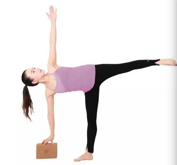 由战士第二式进入,右手向下轻扶瑜伽砖,将重心移至右腿;左手扶髋,吸气,伸展脊柱,呼气,左腿抬离,平行于地面。