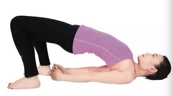 仰卧,屈膝,脚掌落地,双脚分开等同于肩宽;双手十指交扣,伸直手臂,旋动双肩向内收;