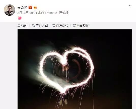 一过零点,吴奇隆就晒出了一张爱心形状的烟花图片,并且配上了爱心的表情,为爱妻庆祝32岁的生日,非常甜蜜,虽然照片中烟花巨大,但是粉丝们还是看出了模糊的刘诗诗的身影,就连糊照都能看出刘诗诗非常可爱。