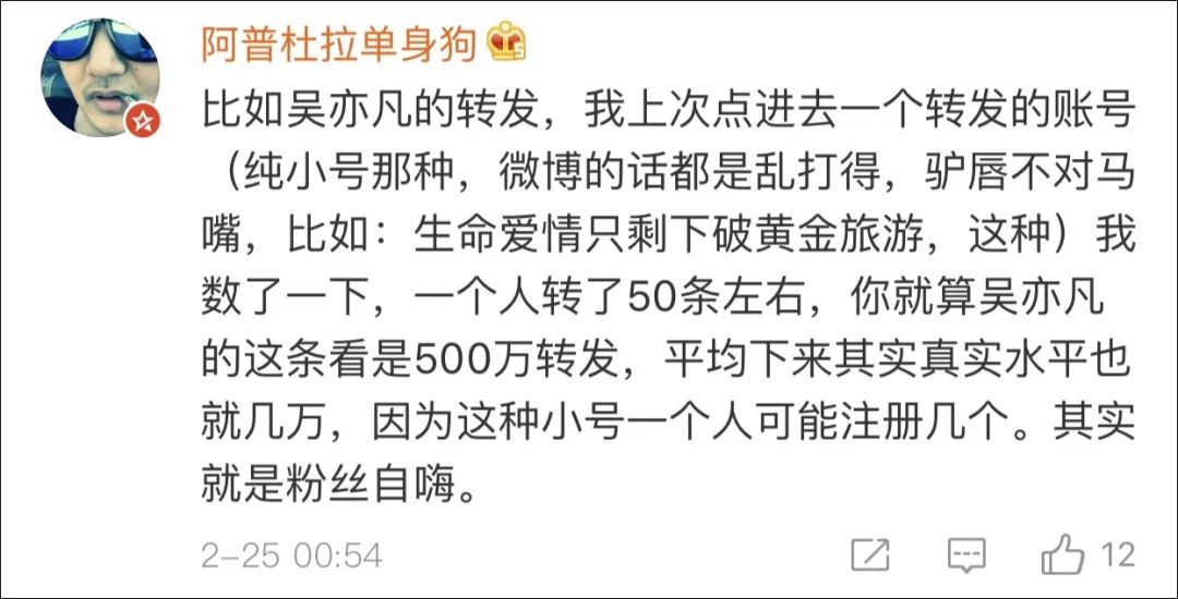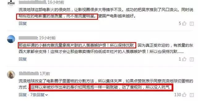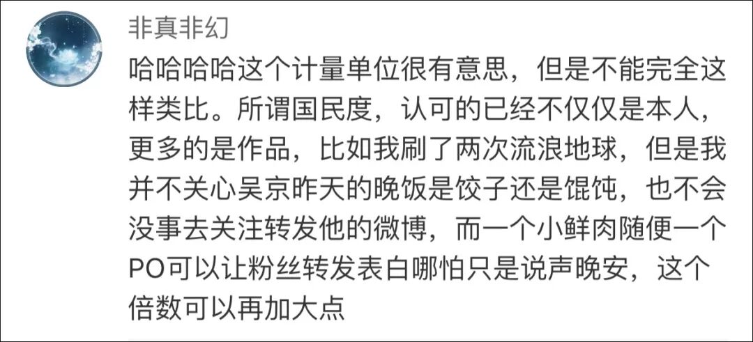 也有网友认为,演员和偶像不一样,将两者混为一谈是故意混淆视听,毕竟,有些人喜欢看《流浪地球》,但不一定会去关注吴京本人的微博,而流量明星们随便一条就可以让粉丝们转发表白,让粉丝有参与感,所以其微博转发量没什么需要质疑的。