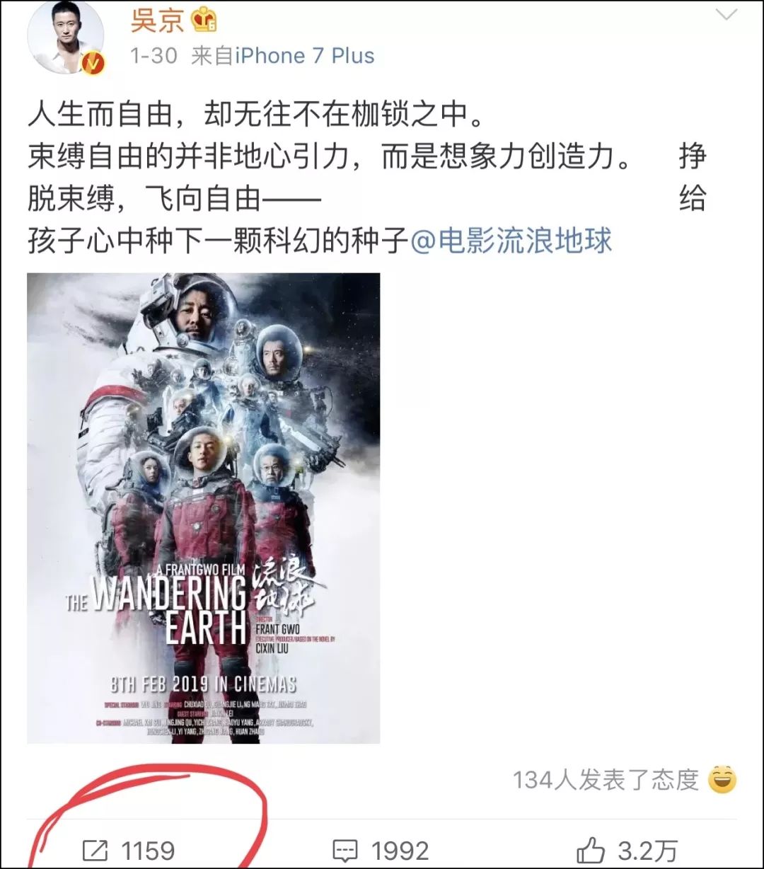 作者认为,事实上《战狼2》与《流浪地球》的大火建立起的真实坐标体系也直接导致流量系的数据结构崩盘。毕竟,如果一个微博转发量仅有2000的吴京能拿下一百亿票房的话,那么各个“500京”的不得轻松拿下五万亿票房吗?
