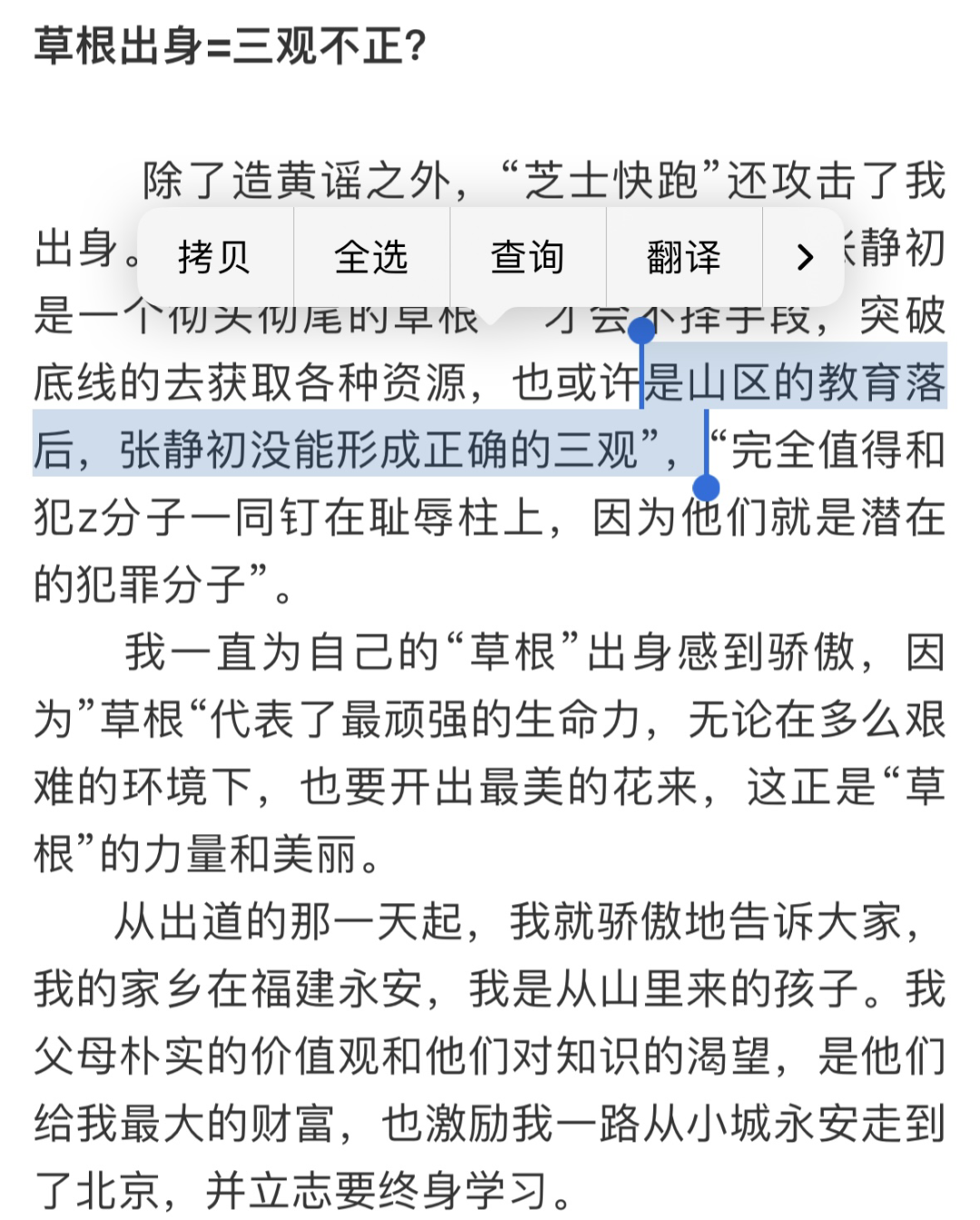 张静初:当被争议的名女人消失后 伊姐看电影 内地女星 2023-01-18 09:27:46 382 创作不易,用心坚持,欢迎请BaGua喝几杯爱心咖啡!打赏并支持本文 打赏并删除本文 了解伊姐本人最新动态、参与线下活动加伊姐微信:eemoviekf04(不闲聊) ♪ 你如此特别,我又怎会失望 ♫ 每天上午9:30,伊姐在这等你 文 | 伊姐(周桂伊) 叶子姚前几天,荧幕上许久未见的张静初发文和视频,分享自己打赢了官司。首度公开讲述自己十几年遭受造黄谣和网暴之苦。她称之为“一场打赢的官司,一场失败的维权”。其中某视频网站一天数起视频,造谣她靠男女不正当关系谋取表演机会、被封杀、被掌掴等等。张静初将其告上法庭,半年前赢了官司,该视频平台至今尚未公开道歉。镜头前,张静初用自身经历鼓励遭遇黄谣和网暴的女性站出来。因为造黄谣是打压一个女性成本最低的方式,相当于社会性死亡。被造谣的女性,可能一辈子无法撇清,这件事,无法清者自清。“一个无中生有的黄谣,就可以简单粗暴地抹杀掉我们在工作中付出的汗水,努力,以及取得的一切成绩,更得承受长期的“荡妇羞辱”与人格诋毁。”关于这段“黄谣”,大家可能也略有耳闻。目前百度一下“张静初”,出现的前几个词条依然很荡妇羞辱,我们就不放图,二次伤害了。自然而然地,那些年事业上的巅峰低谷,都被流言蜚语一并冲刷。很有意思的是,这些视频非常能自圆其说,把张静初的放荡,源于“山区的教育落后,没能形成正确的三观”。联系最近火出圈的“万柳少爷”,仅仅因为带了北京某豪宅地标,瞬间涨粉无数,引发一众小女孩对“富养的男孩温柔、美好、勤奋”的想象,人类慕强的基因,用在出众的美女身上,接近薄凉。她也没做错什么,大概就是没有背景,却又忽然成名。20岁出道,25岁就凭借《孔雀》获得华语电影传媒大奖最佳女主角,该片在第55届柏林国际电影节获得了评委会大奖银熊奖。同一年,另一部《花腰新娘》,又让她拿走北京大学生电影节最佳女主角。此后几乎每年,张静初都有口碑不错的作品上映。合作的都是名导大咖,基本上每拍一部电影,就获奖或提名。《芳香之旅》,讲述一个女人前后四十年的生命旅程,张静初凭该片获得第30届开罗国际电影节影后。犯罪片《门徒》,合作刘德华、吴彦祖、古天乐,张静初在片中饰演一个为帮丈夫戒毒自己染上毒瘾的女人。(网友评价:那么多大腕儿都没能盖住她的出色。)后来许鞍华导演的《天水围的夜与雾》、陈木胜执导的首部华语变异人动作电影《全城戒备》,和《门徒》一起,都曾让张静初提名金像奖最佳女主角。2010年,张静初在《唐山大地震》里演被放弃的女儿方登,她又凭借此片拿到金鸡奖、百花奖、金马奖最佳女配的提名。最红的时候,张静初也有尝试向国际化迈进,被誉为下一个章子怡。(与成龙合作国际大片《尖峰时刻3》,参演历史传记电影《拉贝日记》,还参与过意大利悬疑电影《危情黑吃黑》,以及动作片《碟中谍5》。)让这一切戛然而止的,是横空出世的各种流言蜚语。拍完《唐山大地震》后,她陷入抑郁情绪(最近发文,她也提到了2008年到2011年自己在抑郁边缘),选择赴美求学。两年前,她接受《新京报》采访时回忆说:“这个决定绝不是在冲动的状态下做出来的,我从小就不自信,在打压式的教育下长大,一直觉得自己不够好,而我认为唯一能把自己变好的方式只有不停的去学习,学习永远是最对的选择,因为总有一天自己学的东西能用上。”在张静初的规划里,每年只接拍一两部作品,花三个月时间在纽约学习,每年如此。(慢下来的张静初拍了几部比较轻松的爱情片:《万有引力》《醉后一夜》《脱轨时代》,也拍了被观众骂惨的《富春山居图》。)她其实一直没闲着,转战小荧幕,接拍了都市题材电视剧《咱们相爱吧》《假日暖洋洋》;尝试参加了综艺节目,在《开拍吧》,以演员身份合作拍短片;上《演技派》,与吴镇宇、张颂文一起担任表演导师。这几年大荧幕上最亮眼的表现,是在电影《无双》里一人饰两角,并凭此片再获金像奖影后提名。电影快结束,信念彻底崩塌的女主角,笑着面对破碎的爱情,眼泪掉下来,是这部电影最高光的片段之一。2020年,张静初回到话剧舞台,主演了中文舞台剧版《被嫌弃的松子的一生》。前后时长4小时的表演,被她称为自己职业生涯里最大的挑战之一。没错,更多时间“消失”在大众眼前的张静初,早就不“红”了,但私底下的她,好像活得更充实了。张静初每年拿出三个月在美国学习,看各种展览、百老汇演出,参加当地喜剧俱乐部,用英文讲脱口秀;在美国参演了轻喜剧电影,最近半年又刚完成了一个英文喜剧的拍摄。计划在电影、心理学、营养学等方面继续深造学习,现在人在美国,前几天刚完成托福考试。闭关突击26天,考过了100分,而且口语竟然拿到28分。她把备考过程录下很多vlog 分享,包括复习进度、备考经验、学习方法,还同步每天的饮食、考场状况等等。很真实的“非女明星”备考日常了。像每个备考人一样,26天,她除了出门跑步4次,基本不出门,一日三餐加简单家务一个小时。指甲不做,头发不剪,从早到晚学到瘫。学英文备考过程中,练习口语,她还结合自己的表演功底,想出一套“面具学习法”,让英文口语更地道。这段分享大家感兴趣可以看一下,语言和表演的相辅相成利用地很好,也很可行。回顾这大半年,