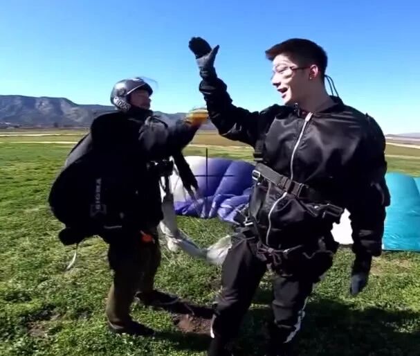 落地之后的陈学冬,他的腿也没有软,第一次高空跳伞,着实难得,就像网友说的“陈大胆,了解一下”。