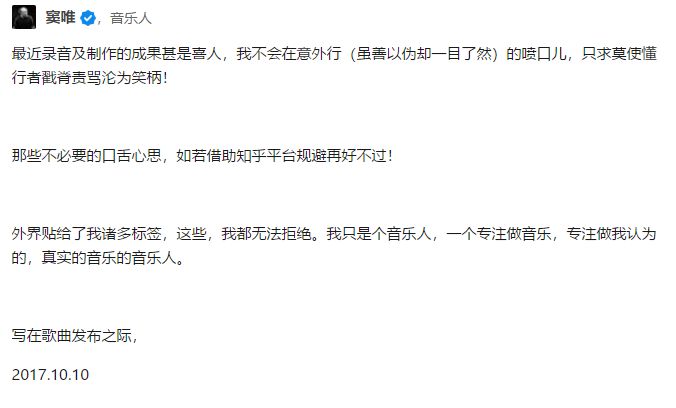 但对于这一切,窦唯想必都是不大在意的。去年,同样在十月,窦唯罕见地在网络平台亲自发文,其中写道:“外界贴给了我诸多标签,这些,我都无法拒绝。我只是个音乐人,一个专注做音乐,专注做我认为的,真实的音乐的音乐人。”一年过去了,在这篇文章下面,有六万多个网友点赞。