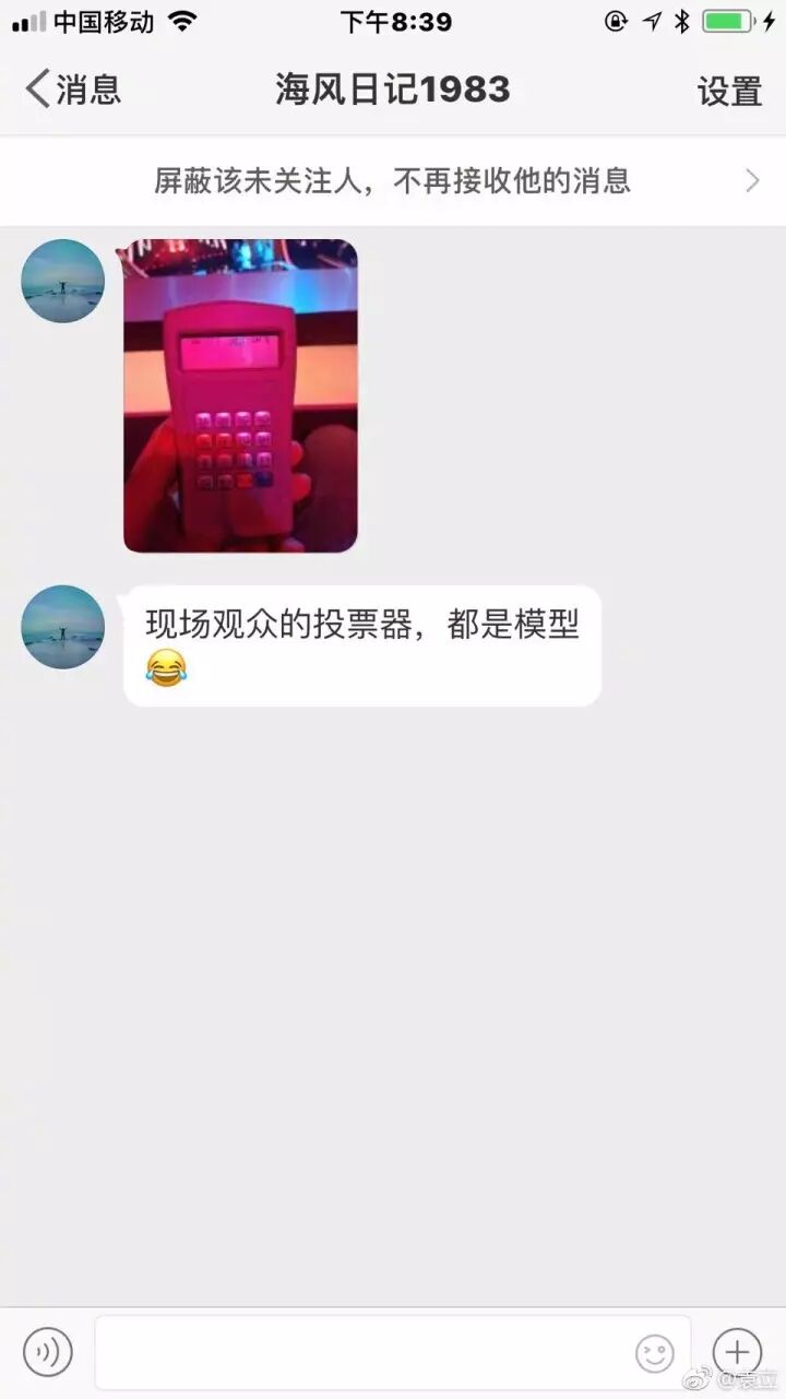 后来又爆出了参加现场录制的网友私信给自己的图片,指出节目现场观众投票器只是个模型。