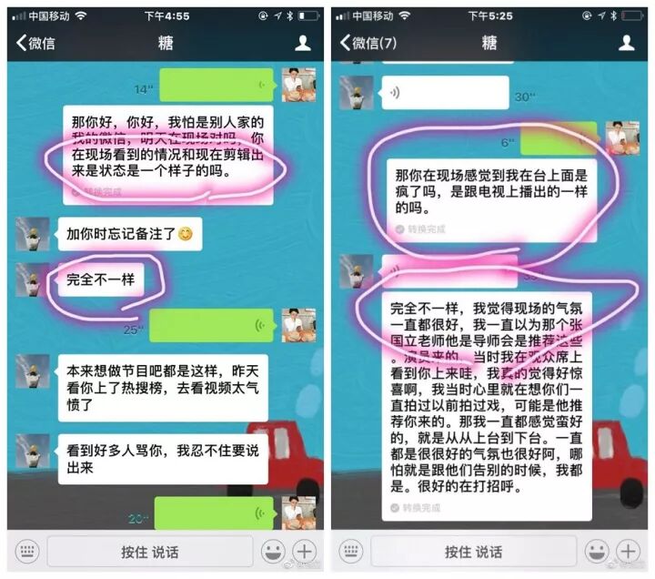 并且在昨天下午又公开了自己与一位现场观众的聊天记录,以证明节目剪辑确实与现场不符。