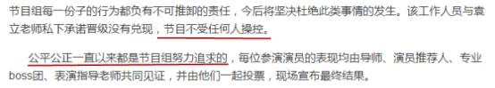 前期的“保证晋级”和不恰当言谈是邀约的小导演个人行为,节目不受任何人操控;