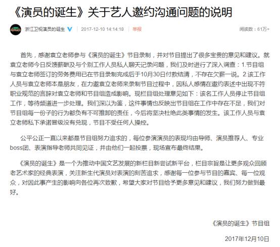 解释说袁立的劳务费已经在录制完成后10月30日结清;